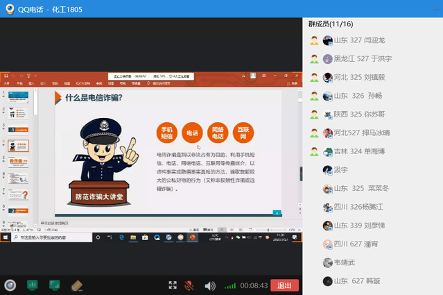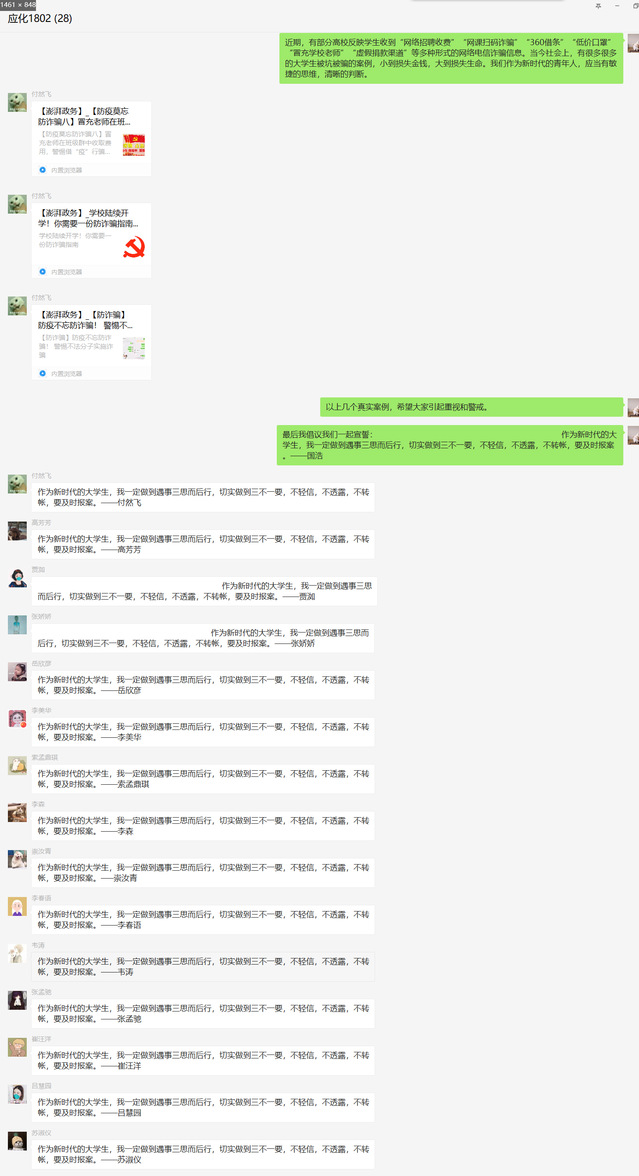 为维护员工们的切身利益,教育员工进一步增强防诈骗意识,预防各类网络电信诈骗事件,3月23日—3月27日,2018级各班级相继开展“预防网络电信诈骗,提高安全防范意识”主题线上班会。