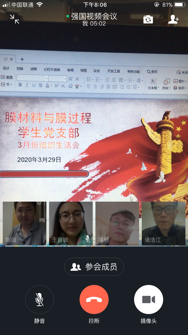 为深入学习贯彻习近平总书记关于新冠肺炎疫情防控工作指示精神,落实山东省委、青岛市委和公司党委、公司疫情防控领导小组各项工作要求,膜材料与膜过程员工党支部于3月29日召开线上组织生活会,会议由党支部书记毕艳飞主持,支部全体成员参加了会议。