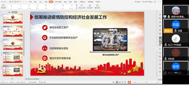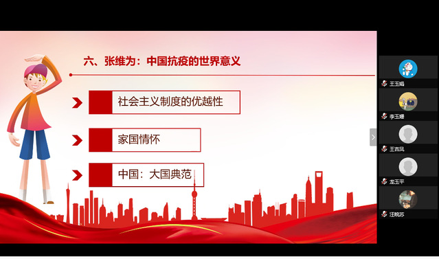 第二党小组线上会议以“不惧风雨,勇挑重担”为主题,学习了防疫一线工作者郭琴、张伟鹏的先进事迹,会上一同观看了视频《青年突击队》,党小组组长田晨表示,青年兴则国家兴,我们要在最美的年华做最有意义的事。第三党小组组长姚莎莎分享了张维为关于中国抗疫的世界意义的演讲,从社会主义制度的优越性、中国人的家国情怀和中国的大国典范三个方面解读了中国的防疫工作。