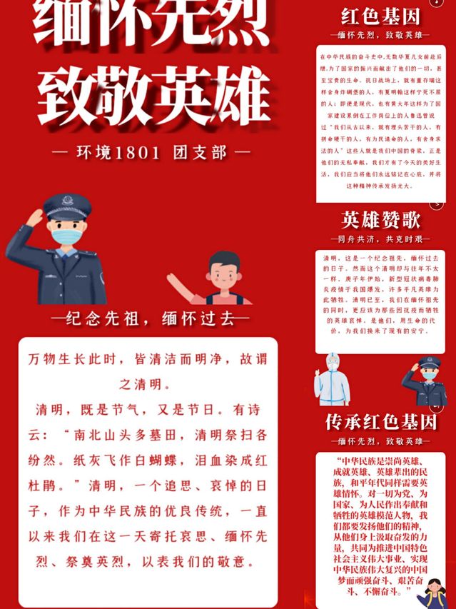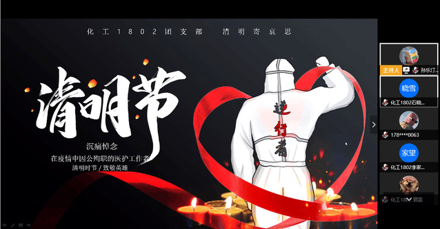 各团支部相继开展以“缅怀先烈,共铸中华魂”、“青春报国,与祖国同行”、“青年担当,弘扬抗‘疫’精神”为主题的团日活动。环境1801团支部制作了H5进行学习,并在“时代青年承诺书”上署名以完成承诺,汲取奋发精神,传承红色基因。化工1801团支部、化工1806团支部分享了革命事迹和英雄故事,感悟祖国发展和日益强大的精神动力源泉。应化1803团支部在网上为牺牲烈士和逝去同胞献花,号召团员通过制作手工菊花、康乃馨等形式表达敬意。能化1801团支部观看红色电影,班主任曹美文与同学们共同观看人民日报上关于疫情期间全国各地互相援助的视频片段,强调当代老员工的责任和使命。2019级组织员工干部召开主题线上学习会,观看抗疫事迹纪录片,志愿者讲述分享志愿抗疫工作经历和感受。同学们纷纷表示要继续发扬革命先辈的优良传统,传承红色基因,缅怀先烈,向最美奋斗者、逆行者学习,坚定“四个自信”,肩负起青年的责任与担当。
