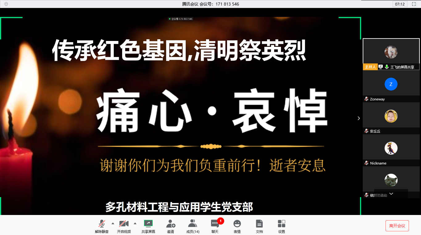 公司在全体员工党员中组织开展“清明祭英烈”主题教育周活动,各员工党支部组织员工党员们积极登录文明网、青年网、人民网、新华网等各大网站,以在线送花、留言、贴挽联等方式缅怀为民族为国家献出生命的英雄烈士;组织员工收看缅怀先烈主题教育影片,回顾先烈们的英雄事迹;各党支部进行“传承红色基因、清明祭英烈”为主题的宣传教育活动,让员工们深入了解清明节的由来,在熟知革命历史的基础上,从内心深处认识到清明节的意义所在。其中,化工系第一员工党支部共同学习了《清明祭英烈,聆听习近平总书记讲述的八个红色故事》文章,通过相互讲述红色英雄事迹和分享学习心得的形式,加深对英烈的丰功伟绩的了解,学习其高尚的品格情操,树立正确的价值观;应化系员工党支部各党小组组织观看红色影片、重温革命家书、共讲一堂党课等形式缅怀先烈与本次疫情中牺牲的工作人员,强调只有以实际行动做好工作、发挥党员的模范带头作用,才是对英烈最大的告慰;多孔材料工程与应用员工党支部支部全体成员集体学习了这次疫情当中被评为首批烈士的14名抗疫工作者先进事迹,并向逝世同胞表达了哀悼。