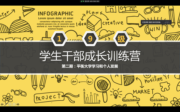 本期训练营的主题为:“平衡大学学习和个人发展”。会议伊始,杜洪龙先结合自身学习与工作经验,围绕“平衡大学学习与员工工作”提出个人独到见解。他认为员工工作应该建立在学有余力的基础之上,两者应该互不干涉,互不占用时间,不要拆东墙补西墙。随后,李尚喆雯与大家讨论了如何平衡大学学习和娱乐时间。其间她指出我们要以良好的心态作为时间管理的基础,不要急于求成。她认为一个好的时间管理者不要有过于具体的计划,计划尽可能全面而广泛。最后她从“找到自己的学习方式”,“娱乐和学习要兼得”,“学会取舍”等三个方面总结出一套学习与娱乐方面的平衡法则。活动最后,马鸣宇同学就“快速适应大学学习”方面提出了自身的看法,他认为快速适应大学学习应该把主要的精力与时间放在课前预习上。首先,通过预习我们可以找到自己理解比较困难的地方,以便在课堂上有重点的听课。其次他介绍了课前预习的方法,也就是对课前的预习做一个自我认识与概括,然后和老师讲的内容做对比,查漏补缺。