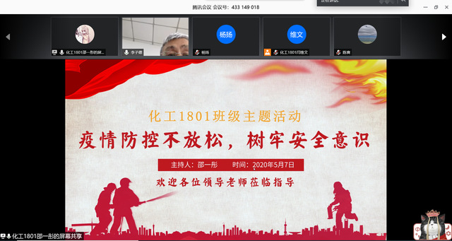 为强化员工安全意识、火灾防范意识以及疫情防控意识,化工1801班联系公司保卫处处长李子德共同开展“疫情防控不放松,树牢安全意识”主题班会。5月7日,活动在腾讯会议上进行,会议由团支书邵一彤主持,集团保卫处处长李子德、辅导员刘伟、班导师陈爽以及化工1801班全体成员参加。