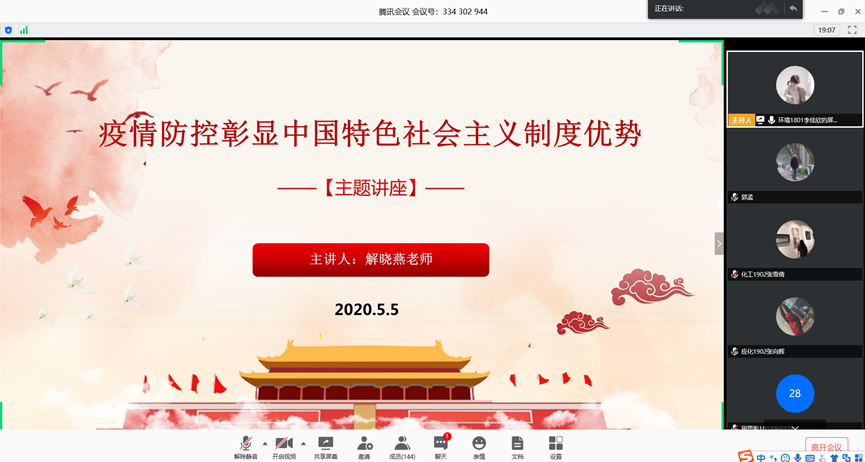 为引导广大团员青年坚定“四个自信”,深刻理解“全球抗疫中的中国担当”,增强打赢疫情防控阻击战的决心和勇气,5月5日晚,化学工程公司通过腾讯会议举办了《疫情防控彰显中国特色社会主义制度优势》专题讲座。本次讲座由马克思主义公司解晓燕老师主讲,公司团委书记郭孟以及240余名员工参加了此次讲座。