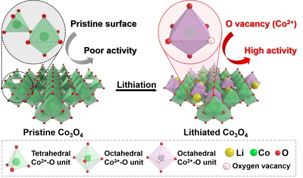针对上述问题,该研究成果首次提出利用电化学嵌锂引导锂嵌入四氧化三钴晶格,削弱了钴-氧键的配位,诱导形成大量氧缺陷。首先,嵌锂导致载流子浓度显著增加,使得材料本征电导率明显提高;其次,表面氧缺陷的钴位点对于氢氧根离子的吸附能显著降低,促进了充放电反应过程中的钴的氧化还原反应,进而大大提高表面的反应活性;最后,氧缺陷可以作为电化学活性位点参与储能,进一步突破了过渡金属氧化物材料电荷储存容量以达到优异的储能性能。同时,该方法解决了当今报道的氧缺陷调控策略存在的高能耗和可控性低等技术难题,该研究成果在电化学能源转化与储存、电解水和光催化等领域有着广阔的应用前景。
