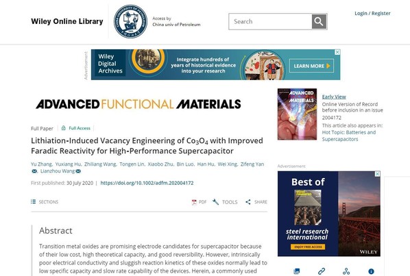 近日,公司阎子峰教授领衔的催化材料团队与澳大利亚昆士兰大学王连洲教授合作,在超级电容器法拉第电容材料缺陷调控方面取得最新进展,相关研究论文《嵌锂诱导四氧化三钴缺陷调控实现高法拉第反应活性和优异超级电容器性能》(Lithiation-Induced Vacancy Engineering of Co3O4 with Improved Faradic Reactivity for High-Performance Supercapacitor)在国际材料领域权威期刊Advanced Functional Materials上发表。公司化学工程与技术博士后科研流动站张誉为该论文第一作者,阎子峰教授和澳大利亚昆士兰大学王连洲教授为共同通讯作者。MK体育官网为第一署名单位,该项研究成果得到国家重点研发计划、山东省重点研发计划和国家留学基金委资助。