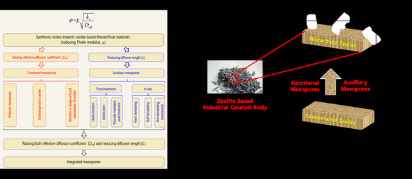 针对上述问题,公司阎子峰教授与敏托娃教授团队,从催化反应工程角度讨论了如何通过多级孔结构的设计提高沸石的扩散性能与催化效率:他们根据催化效率提升的主要原因,将引入的沸石介孔结构划分为“功能型介孔”(functional mesopore)、“辅助型介孔”(auxiliary mesopore)和“综合型介孔”(integrated mesopore)三大类,并分别对其制备工艺、孔道结构表征技术和催化反应性能进行了评述。