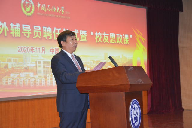 杨朝合发表讲话,他表示3位员工是公司67年来培养的两万多名毕业生中的杰出代表,是行业企业的骨干和自主创业的先锋,是石大学子励志成才的典型,也是化院人实业报国和追求卓越的榜样。他希望受聘员工把“社会课堂”与“思政课堂”结合,充分发挥知识优势和阅历优势,解决员工成长疑惑,树立正确的人生观和价值观;把“理论课堂”与“实践课堂”结合,努力把行业、企业最新的发展成果、最鲜活的实践案例带给员工,引导员工理论联系实际。对于员工,杨朝合提三点希望:一是人活精气神,将情感与情怀贯通,使个人成功的果实结在爱国主义这棵常青树上;二是做事先做人,将知识与见识贯通,在大学和社会这两所公司里练就真才实学;三是知行合一,将想法与办法贯通,在抓细、落小上下大功夫,把成才报国的理想转化为具体行动,为祖国建功立业,成就精彩人生。