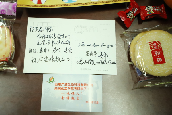 考研员工收到礼物和文章鼓励后都表示充满了前行的动力,其中化学工程与工艺1701班刘妍汝表示:“年级为我们送温暖的活动让我感到非常开心和暖心。在考研复习关键阶段,我一定会迎难而上,坚持到底,不给自己留遗憾!”