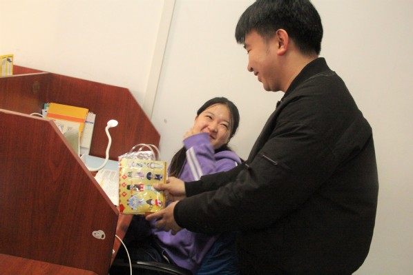 活动前期,由辅导员姜菲挑选采购温暖小礼包,其中包括暖水袋、小零食、写满鼓励话语的贺卡、寓意心想事成的橙子等,这些礼品均由山东广浦生物科技有限公司赞助。在礼品分发过程中,窦雅琴问候了员工们的学习情况,关注员工们的身体健康,同时还询问了员工考研自习室暖气供应是否正常,光线是否合适等问题。窦雅琴对考研员工说道:“希望你们调整好自己的心态,坚定信心,以最好的心态迎接考试,预祝你们金榜题名,考研成功!”