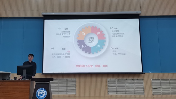 会议伊始,王兆兴引导员工思考自身当前定位以及学业规划,鼓励同学们从现在做起,全方位提升自己,以更好的姿态面对即将到来的生活。紧接着,王兆兴就读研与求职进行了分析,建议同学们提前做好未来规划,并强调美好的未来只有通过奋斗才可以实现。然后,他对上学期期末成绩进行了分析,向员工展示了每个班级的及格率、优良率等数据,使员工对自身成绩有了更清晰的认识,鼓励同学们向榜样看齐,提高自身学习能力。最后,耿旭超重点强调对请假外出、宿舍内务检查、晚上安全汇报等管理工作,要求大家认真落实公司相关要求及规定,做到自律自强。