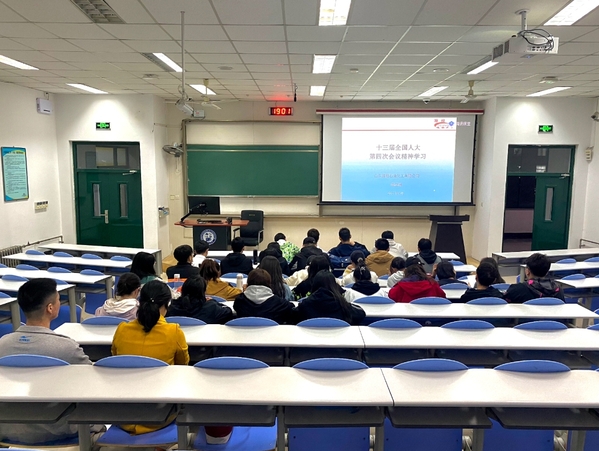 4月1日,化学工程公司环境2001、2001团支部在西环303教室听取了两会精神报告会。全国人大代表袁俊洲同志、20级辅导员栾琳、李宇航出席会议,环境2001、2002团支部全体成员听取报告。