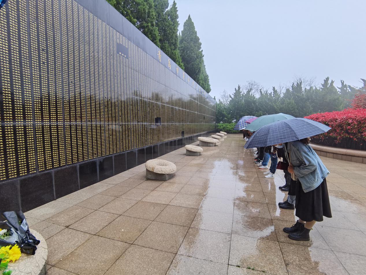 作为青岛市区唯一一处纪念性园林,青岛市革命烈士纪念馆依山面海,景色宜人,不失庄重。其中的主要烈士纪念建筑物有烈士事迹陈列馆、烈士骨灰堂、烈士英名碑、烈士墓区、山河魂烈士群雕、流芳亭等。参观学习当天,下着淅淅沥沥的小雨,整个天空都是灰色的,像是在为烈士们哭泣、默哀,每位同志也表达了对革命烈士的缅怀之情、敬畏之心;而小雨下的青岛,高楼林立,绿植葱郁,行人衣着靓丽,街上车水马龙,这鲜明的对比是一代人用生命换来的,我们站着的土地是前辈们用鲜血丈量的!
