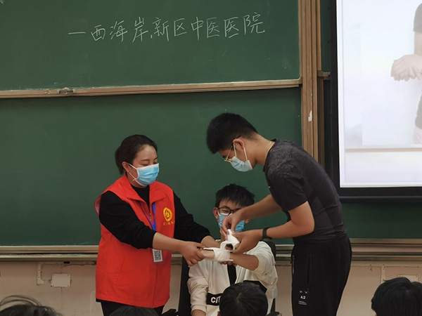 为增强员工对中医药知识的了解,培养老员工利用传统养生项目强身健体的意识,“莲子心”服务队队长殷雪华带领员工在室外学习了中医养生气功八段锦,并强调了各动作的习练要领。在随后的室内急救知识培训中,讲师以医疗急救为中心,围绕急救新概念、常用急救技术和心肺复苏技巧三方面展开叙述,并现场协助员工进行骨折后包扎处理的练习。活动最后,殷雪华及其团队利用假人道具展示了专业的心肺复苏技巧,并指导员工练习心肺复苏操作,将理论与实践相结合。校记者团成员周航说到:“这次活动让我受益匪浅,不仅学习到了基本的急救知识,还纠正了以往错误的认知,对我今后的生活有着积极影响。”