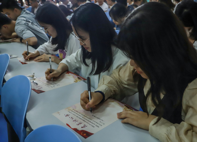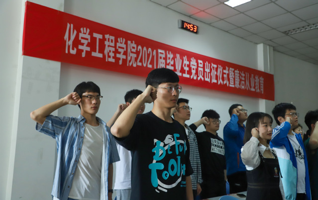 毕业生书写出征决心书是公司自1954年以来保持的优良传统。2021届毕业生党员在决心书上郑重地写下了自己对母校、对祖国的承诺。保送至清华大学的2017级环境工程专业本科生李燕君写到:“脚踏实地,将论文书写在祖国的大地上。成为研究生后我将继续努力学习,认真从事科研创新工作,将自己的科研与实际应用相结合,为环境工作做出自己的贡献。”考取选调生的2018级化学工程与技术研究生迟又杨写到:“我将在基层扎根,上面千条线,下面一根针,要做到群众之事无小事,做好党的政策传声筒与百姓的贴心人,要做到嘴里有乡音,脚下有乡土,心中有乡情。”书写完决心书后,全体党员进行出征宣誓,重温入党誓词。