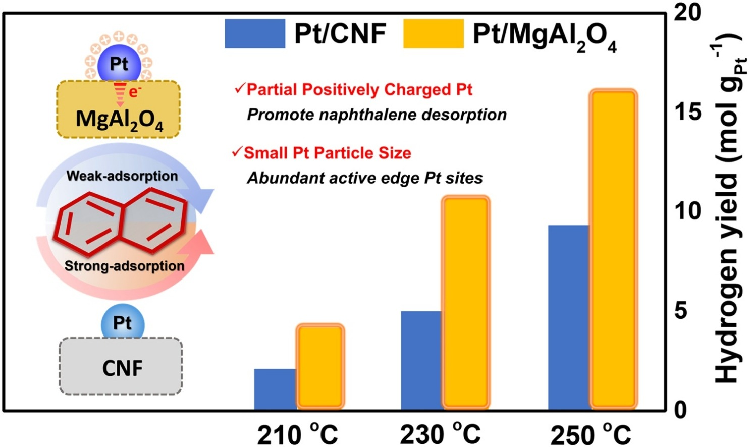 有机氢化物储氢相比传统高压储氢技术,具有储氢密度高、液态储运安全方便等优势,有望在大规模、长距离、季节性的氢能储运场景中发挥重要作用。该成果利用MgAl2O4通过载体-金属强相互作用调控Pt的电子结构,使Pt处于微正价态,减轻了脱氢产物萘在高活性Pt位点上的吸附,从而实现了优异的十氢萘脱氢活性,几乎是目前最先进Pt/CNF催化剂的两倍。表征结果和DFT计算表明:Pt与尖晶石氧化物表面氧原子之间的强电子相互作用导致了局部电荷的重新分布,微正价态的Pt抑制了萘的不饱和碳与Pt之间的π电子反馈作用,从而削弱了Pt与萘的成键强度。最终,结合Pt纳米颗粒尺寸小与产物脱附快速两个优势,使得Pt/MgAl2O4展现出优异的脱氢性能。
