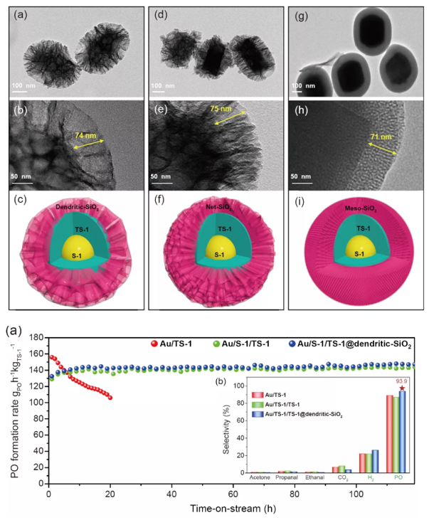 该项工作合成了一种具有树突结构的新型钛硅分子筛载体S-1/TS-1@dendritic-SiO2,其独特的惰性S-1内核和厚度仅为90nm的TS-1活性中间层极大缩短了反应物及产物的传质路径,有利于在TS-1活性中间层上形成的产物快速从催化剂表面脱附,有效避免了含碳沉积物堵塞微孔导致的催化剂快速失活问题。通过在惰性S-1内核和TS-1活性中间层外部包裹疏松的树突状惰性SiO2的方式,利用dendritic-SiO2优先附着于能垒较低的Ti-OH位点的特性,“靶向”钝化了TS-1活性中间层的酸性位点,有效提高了PO选择性。相比较于传统的Au/TS-1,具有树突结构的三层Au/S-1/TS-1@dendritic-SiO2表现出了良好的活性、高达93.9%的PO选择性,以及长达100+小时的催化稳定性。