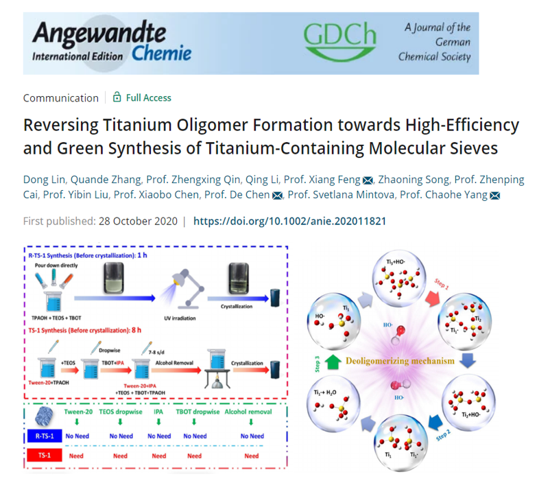 题为《“逆向解聚”:高效绿色钛硅分子筛合成新方法》(Reversing Titanium Oligomers Formation towards High-Efficiency and Green Synthesis of Titanium-containing Molecular Sieves)的成果发表在国际知名期刊Angewandte Chemie International Edition)上。化学工程公司2018级博士研究生林栋为第一作者,杨朝合教授、De Chen教授和冯翔特任教授为共同通讯作者。