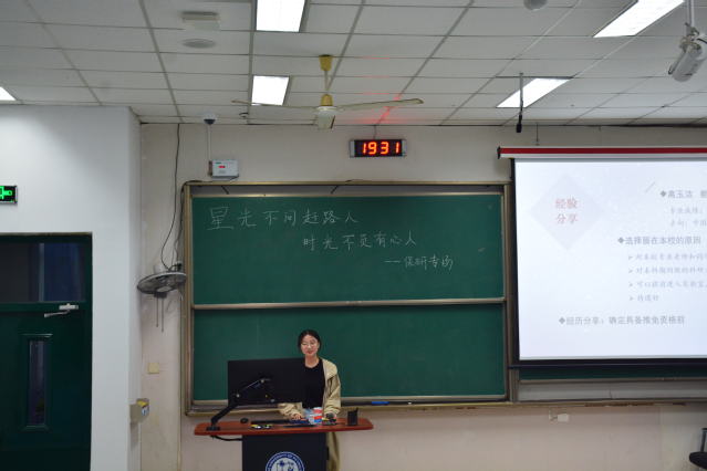 为使更多地同学了解保研相关政策及流程,6月6日,2018级在讲堂群西环103教室举办“星光不负赶路人,时光不负有心人”保研专场讲座。本次讲座由化蕴星光宣讲团2017级员工代表刘樨、李宇航、高玉洁、冉秋燕主讲,2018级100余人参加。