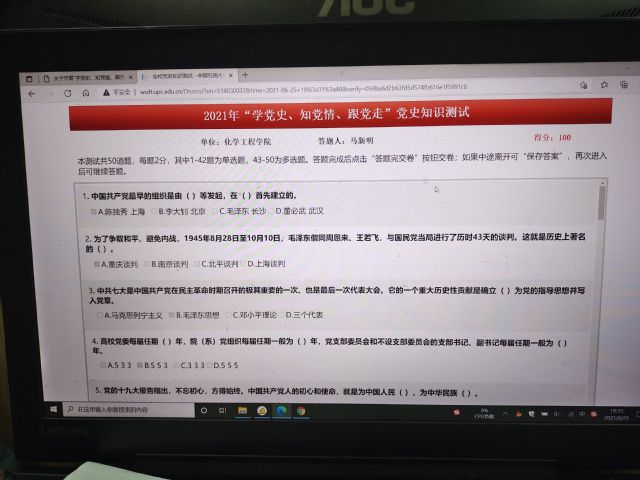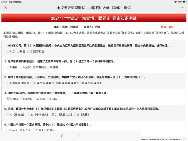 测试采用线上答题形式进行,内容以中国共产党党史为主,同时包括新中国史、改革开放史、社会主义发展史和《中国共产党普通高等公司基层组织工作条例》等相关内容。测试时各位员工党员态度端正,遵守纪律,认真答题,在规定时间内完成了知识测试。员工党员高昶谈道:“通过此次活动,加深了对党史的了解,重温红色经典,真正实现了以考促学、以学促用的目的,决心把党史学习教育内化为行动自觉,以实际行动迎接建党100周年。”