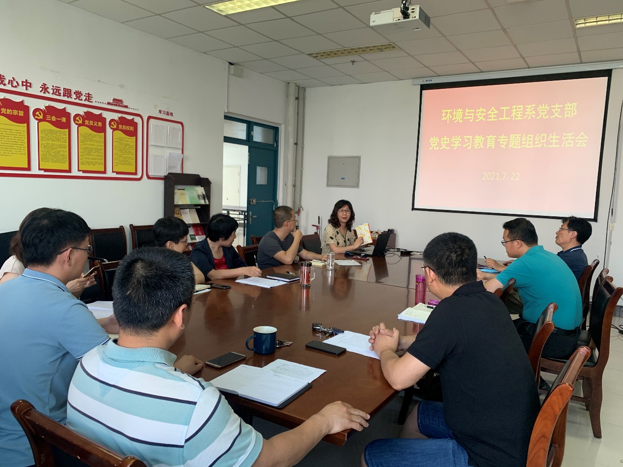 围绕“学党史、悟思想、办实事、开新局”主题,认真贯彻“学史明理、学史增信、学史崇德、学史力行”要求,7月22日,环境与安全工程系党支部在工科楼A617会议室召开党史学习教育专题组织生活会。系党支部书记刘芳老师主持会议,公司党委张永宁书记和系党支部全体党员参加。