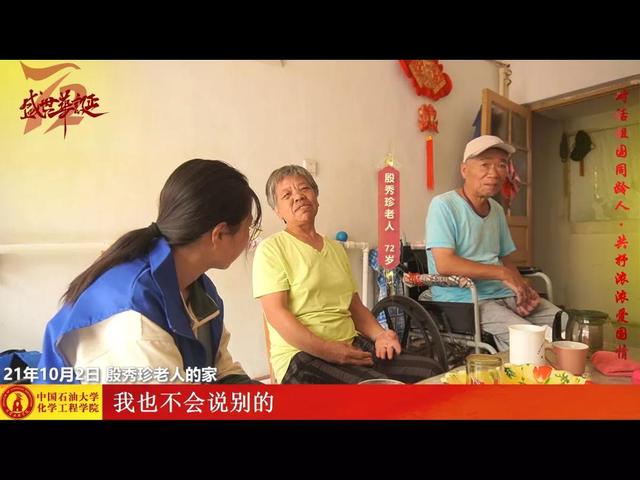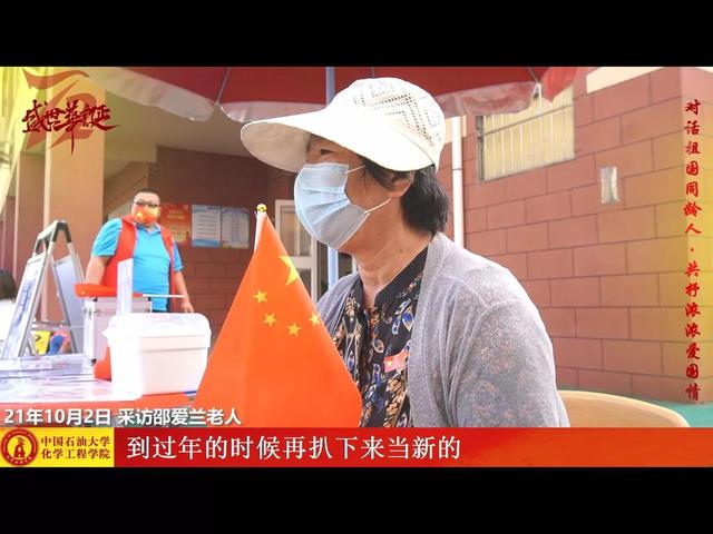 志愿者首先采访邵爱兰、殷秀珍两位老人。谈起小时候对于祖国的印象时,邵爱兰回忆当时:那时候很穷,正赶上大炼钢,家家户户生活都很艰难,家里的食物都舍不得吃,留给老人和孩子。当问到什么时刻最让她感受到祖国的发展时,殷秀珍动情地说:“国家这些年发生了翻天覆地的变化,和以前完全不一样了,现在的政策一天比一天好。前几年我丈夫生了病住了院,一住住了八年。如果没有国家的医疗保险政策,家庭负担十分沉重,这一切都多亏了祖国。”两位老人还谈及了衣食住行的各个方面,两位老人语气中全是喜悦,这些都深切地反映了祖国这些年的巨变。