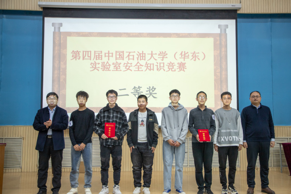 此次竞赛分为初赛和决赛两阶段。比赛初期,赛事组织者通过微信公众号、网站等多渠道发布电子海报、短视频吸引来自16个公司的超2000人次参加。百余支报名参赛队经过一周的准备,进行了激烈的初赛角逐,最终27位参赛选手组成的9支代表队进入决赛。决赛伊始,实验室管理处副处长成宏涛致开场辞,之后,各代表队登场介绍队名与参赛口号。在主持人宣布比赛规则之后,比赛正式开始。经过第一轮必答题与抢答题的角逐后,胜出的六支队伍进入第二阶段的风险题与必答题环节,最终经过激烈的角逐,来自2021级应化专业的第九队脱颖而出获得一等奖,由2020级化工专业员工组成的第一队、理公司2021级化学专业员工组成的第五队获得二等奖,由化工公司2021级研究生组成的第三、第七、第八队获得三等奖,第二、第四、第六队获得优秀奖。除此以外,比赛期间还设置观众互动环节,在场员工踊跃参与答题,赢取了丰厚的奖品。比赛结束后,到场嘉宾上台为获奖队伍颁发荣誉证书和奖品并合影留念。参赛选手应化2101滕国钊在赛后讲到:“本次竞赛的题目与实际操作紧密相关,对于提升大家的安全意识和安全应急处理能力有很大帮助,能有效降低实验中存在的安全隐患。”