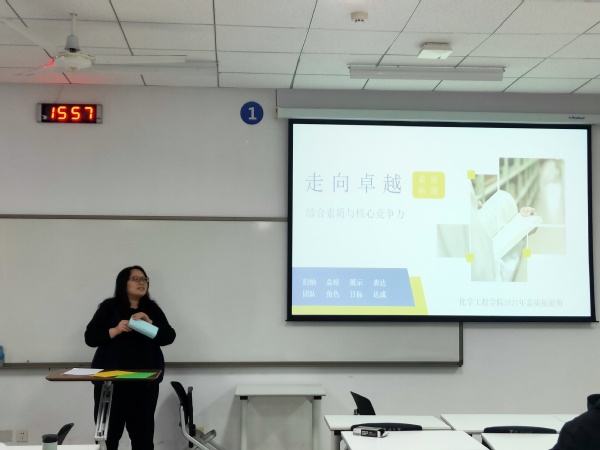 活动伊始,王兆兴介绍了“化蕴素拓班”培训班开展背景和主要内容,表示中高年级本科生们亟需提升平时可能在第一课堂中无法学习到的综合素质和技能技巧,为即将到来的升学和就业选择做好准备。接着他对素拓班全体员工提出珍惜机会、认真学习的要求,并代表32名“化蕴素拓班”员工向主讲人窦雅琴表示感谢。