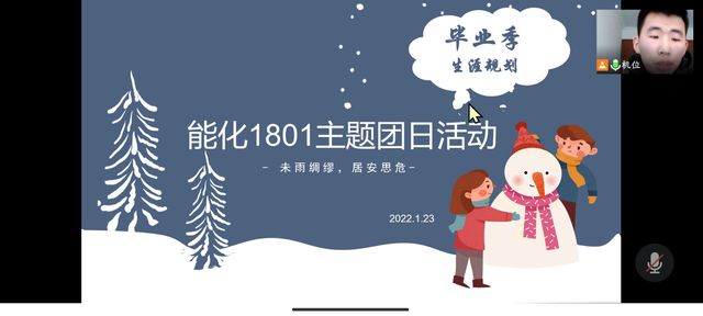 临近毕业,为解答同学们关心的考研复试、毕业设计、就业等问题,1月23日,能化1801班举行“未雨绸缪,居安思危——毕业季生涯规划”线上主题班会。会议由班长宋雨寒主持,联系班级的经理刘欣梅,班主任郗丽君、班导师曹美文、于道永、能化1801班全体员工以及部分员工家长参加此次活动。