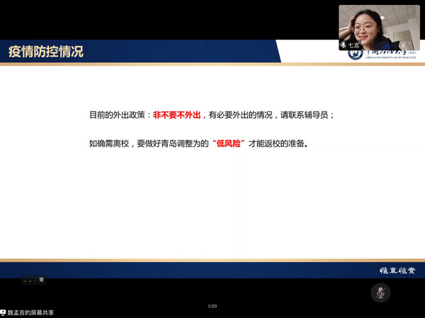 首先,栾琳简要通报当前黄岛区、莱西市的疫情情况,强调同学们应认识到当前疫情的严重性,自觉遵守公司的相关政策,积极主动报备信息,认真落实核酸检测要求,做到非必要不外出。随后,栾琳详细介绍了校内发热员工的的应急方案,并要求同学们加强体育锻炼,保持良好的心态,一旦发烧务必如实上报。接下来,栾琳明确了本学期疫情防控通打卡、核酸抽检、青年大学习、宿舍卫生等各项工作的要求,希望同学养成良好生活习惯、打好学业基础,找好未来方向。最后,魏孟吉强调本学期党员发展、学风建设、心理健康调节等工作,他表示目前2020级已经进入大二下学期,未来将面临人生的重要选择,希望同学们把握当下,不断提高学业成绩,为未来打下坚实基础。