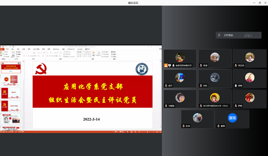 3月14日上午,应用化学党支部召开线上组织生活会暨民主评议党员工作会议,党支部全体成员参加会议,党支部书记杨修洁同志主持会议。