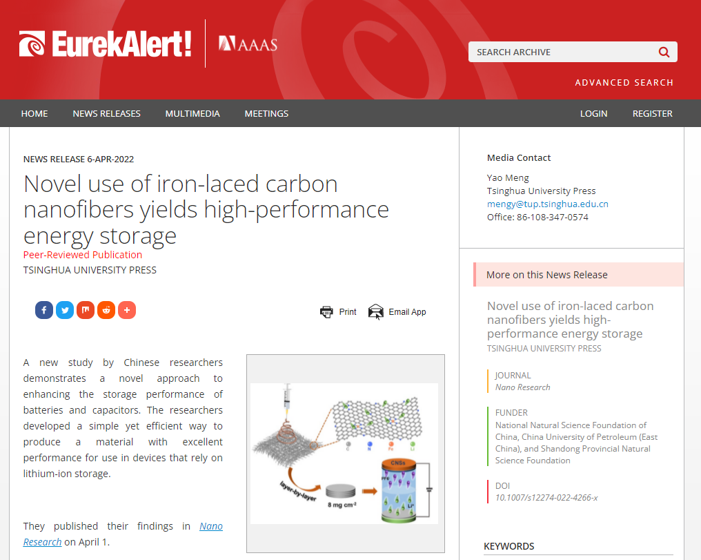 近日,中国科技期刊卓越行动计划领军期刊《Nano Research》发表公司研究成果“Kinetically accelerated and high-mass loaded lithium storage enabled by atomic iron embedded carbon nanofibers”,公司19级研究生徐倩为论文第一作者,公司胡涵教授以及新能源公司吴明铂教授为通讯作者;美国科学促进会(AAAS)主办的科学新闻网EurekAlert!对该项成果进行了报道。