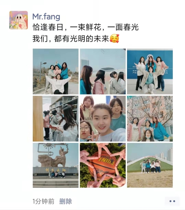为推进2021级宿舍文化建设,丰富员工大学课余生活,激励员工走出宿舍,增强宿舍凝聚力,4月5日至7日,MK体育2021级举办第一期宿舍文化建设——九宫格拍摄活动,2021级全体同学参加。