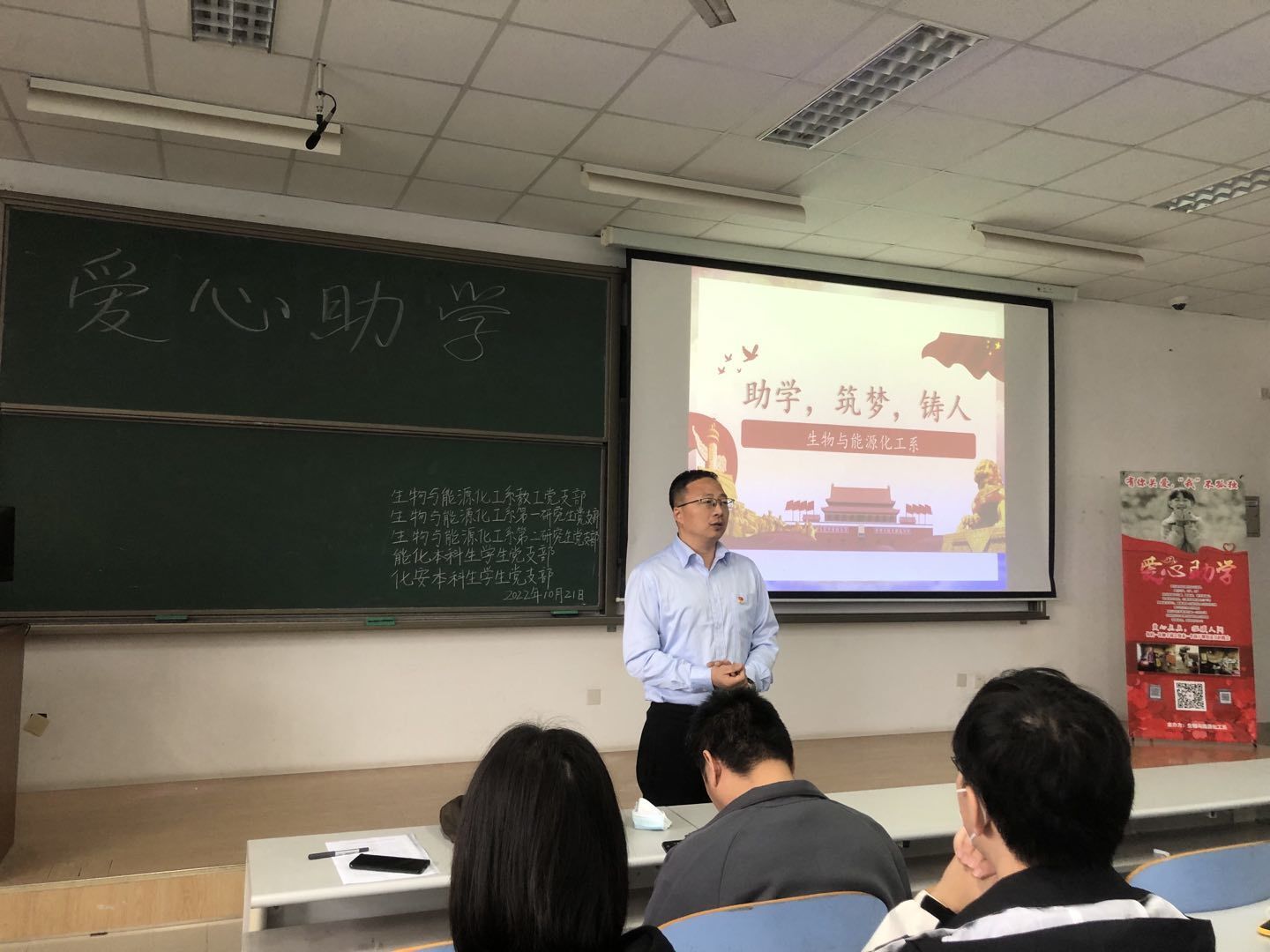 10月21日上午,时值党的二十大胜利召开之际,生物与能源化工系教工党支部、生物与能源化工系第一研究生党支部、生物与能源化工系第二研究生党支部、能化本科生员工党支部与化安本科生员工党支部以党的二十大精神为指引,开展 “金秋助学”动员大会。据悉,这已经是生物与能源化工系师生连续第三年捐助甘肃省陇南市宕昌县南阳镇第二小学的留守儿童和贫困员工。