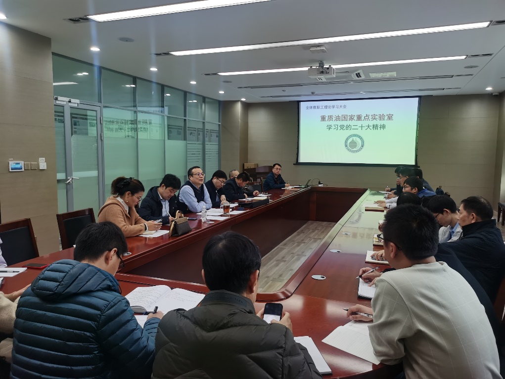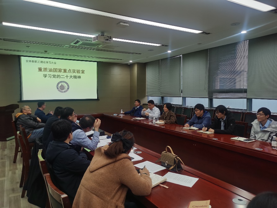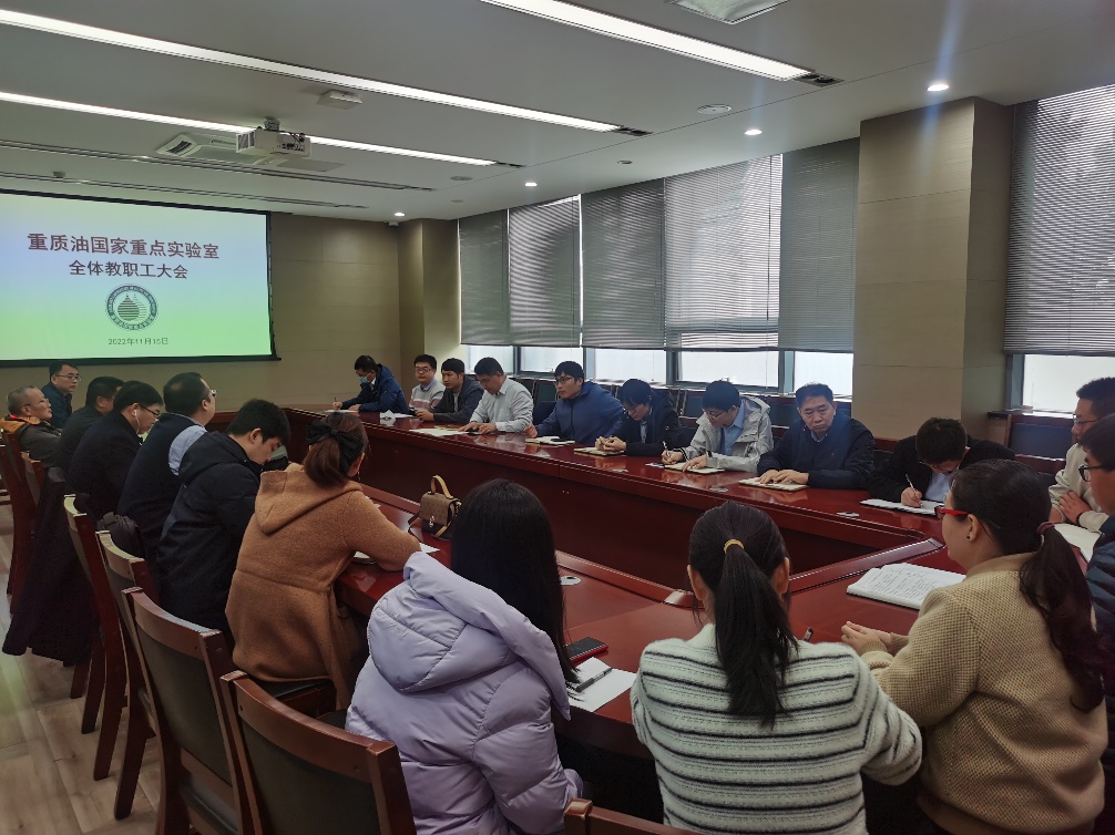 11月15日,重质油国家重点实验室在逸夫楼会议室召开全体教职工大会暨理论学习大会。会议由党支部书记柴永明主持,化学化工公司经理刘欣梅出席会议,重质油国家重点实验室全体教职工参与会议。