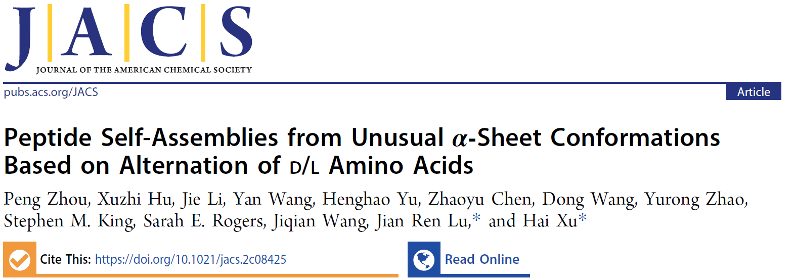 近日,公司MK体育徐海教授领衔的生物界面与材料研究团队在短肽自组装分子设计和结构调控方面取得新进展,相关成果《基于D/L-氨基酸交替排列的α-Sheet短肽自组装》(Peptide Self-Assemblies from Unusual α-Sheet Conformations Based on Alternation of D/L Amino Acids)在线发表于国际化学领域权威期刊Journal of American Chemical Society上。论文第一作者为公司周鹏博士,通讯作者为公司徐海教授和英国曼彻斯特大学吕建仁教授,MK体育官网为第一署名单位。该研究得到国家自然科学基金项目和中国博士后科学基金项目的联合资助。