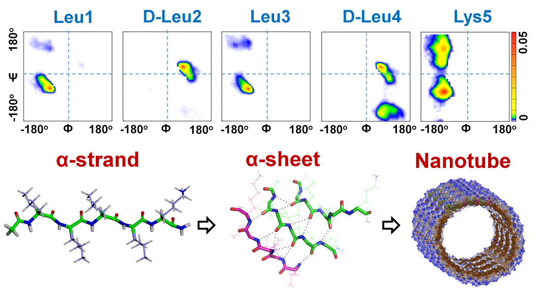 在本研究中,研究者提出了一种基于α-sheet新型肽自组装体系的设计。通过主链中L-和D-型氨基酸残基的交替,并利用亮氨酸强的螺旋构象倾向,设计了类表面活性剂自组装肽Ac-LDLLDLK-NH2和Ac-DLLDLLDK-NH2。通过实验和模拟相结合的研究方法,排除了β-sheet二级结构形成的可能性,并分析了α-sheet二级结构和α-sheet纳米管的形成机制和过程。由于α-sheet为极性sheet,基于该二级结构构筑的有序组装体可能具有不同于β-sheet组装体的特殊性质。这项研究和相应的肽设计策略对今后设计和开发新型肽自组装体系具有重要的指导意义。