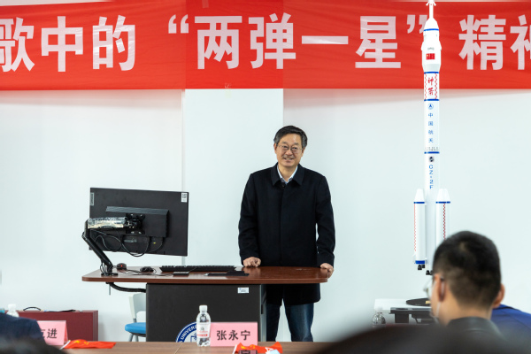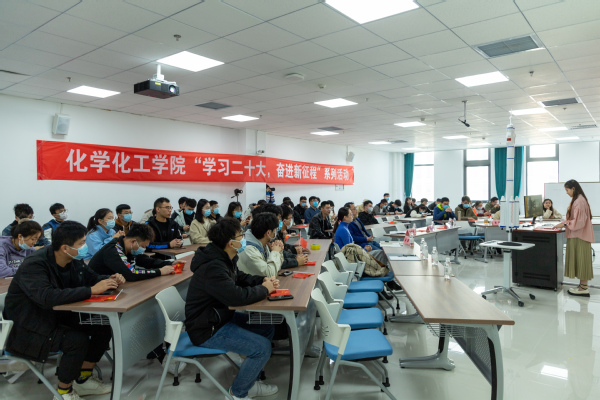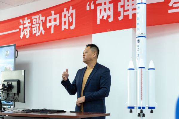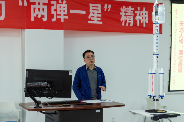本次诗歌品读会以神舟十五号进入发射准备阶段为契机,结合党的二十大精神学习,回顾中国共产党人精神谱系中的“两弹一星”精神。会议伊始,张永宁书记针对主题向化院学子提出了抓住机遇、勇担重任,在相关知识领域取得突破,为国家献力的殷切期望。随后,田克进总工程师为大家带来了《“两弹一星”精神撑起民族不屈的脊梁》讲座,讲述了从“两弹一星”时期到现今及未来中国航天事业的发展历程,从艰苦奋斗到创造辉煌成就,航天事业承载着民族复兴的光荣与梦想。同学们在讲座过程中聚精会神,在因自己是中国人骄傲的同时,也感受到了新时代赋予责任与担当。