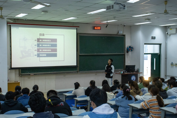 在宣讲前,第二课堂管理部先收集了大一新生关于第二课堂方面的问题,并针对收集的问题将宣讲设计为“二课定义”、“二课意义”、“二课结构”、“学时获取”四个方面,围绕“是什么”、“为什么”、“怎么做”三个角度讲解。