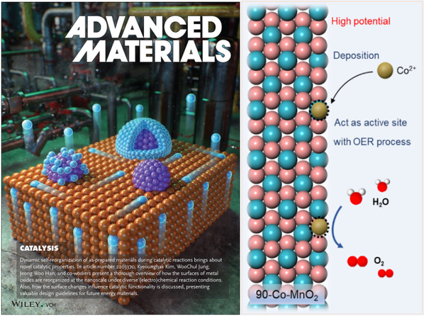 题为《高施加电位助力Co物种在MnO2表面稳定沉积及其酸性水氧化研究》(High Voltage Enabled Stable Cobalt Species Deposition on MnO2 for Water Oxidation in Acid)的成果发表在国际能源材料顶级期刊Advanced Materials(T0,一区TOP)上,MK体育2018级直博生张鑫宇为本文第一作者,董斌副教授和柴永明教授为共同通讯作者。