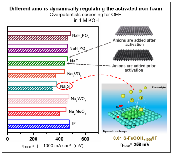 高效析氧电催化剂对于电解水技术的工业化推广至关重要。尽管目前在研发高性能析氧催化剂方面取得了丰硕成果,但仍然缺乏大电流(> 1000 mA cm-2)下稳定运行的析氧催化剂的相关研究。铁基(氧)氢氧化物表现出较高OER本征活性,但纯FeOOH导电性较差,速控步骤(由M-O到M-OOH)反应能垒高,性能提升受限。鉴于此,团队创新性地提出了电解液中动态阴离子调控的策略,研究了一系列阴离子对FeOOH的影响并成功实现了S对FeOOH析氧性能的规律性调控。通过对电解液中离子种类和浓度的优化,使所制备的0.01 S-FeOOH+1000/IF催化剂在1000 mA cm-2的高电流密度下表现出更高的反应活性和超长的稳定性。