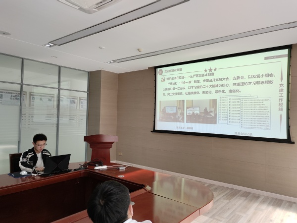 最后,研究生辅导员郭孟老师强调,党建工作是员工工作的“龙头”,要充分发挥员工党支部的战斗堡垒作用和优秀员工党员的模范带头作用,紧紧围绕中心抓好党建工作,助力公司高质量发展。一是强化支委建设,要切实提升支委责任感、使命感,加强业务学习,打造运行有力的支委会;二是加强理论学习,坚持学原文、读原著、悟原理,推动党的二十大精神入耳入脑入心;三是提高工作规范,要认真学习党员发展细则、三会一课等相关制度,严格工作程序,严肃工作纪律;四是打造支部品牌,要充分根据专业特色、课题组特点凝练党支部文化内涵,打造具有支部特色的品牌活动。