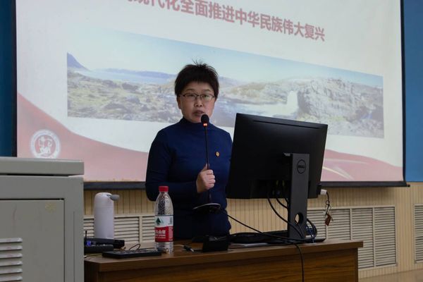 会上,原丽红教授以“迈上新征程,迎接新挑战”为主题,为参会同学系统全面地解读了党的二十大主题,带领广大同学深刻领悟“两个确立”的重大意义,明确了党的二十大召开的意义,宣誓中国共产党对当今中国发展面临的战略环境所作出的新的重大判断。她指出“不谋全局,难谋一域”,提倡广大同学要有大局意识,不要局限于某件事情的局部区域,要审时度势,继往开来!接着,她从新征程、新境界、新状态三个方面解读了二十大的主要内容。带领广老员工学习了中国共产党的中心任务就是团结带领全国各族人民全面建成社会主义现代化强国、实现第二个百年奋斗目标,以中国式现代化全面推进中华民族伟大复兴。最后,她以“时代大风起,狂飙从天落。好风频借力,送我上青云”作结,寄托了她对新时代青年的厚望,时代波谲云诡,新征程的号角已经吹响,广大青年当把握发展机遇,乘风而起,直达青云,做时代的弄潮儿。