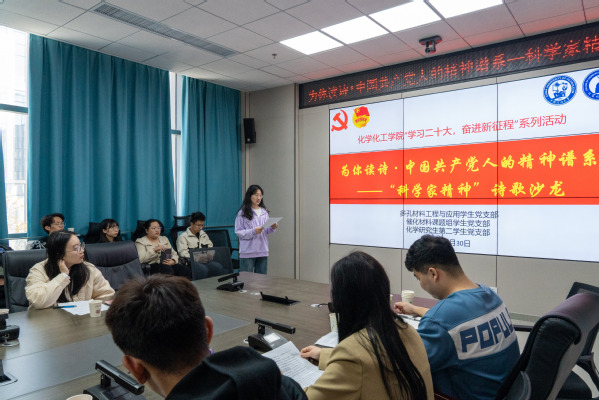 3月30日,由多孔材料工程与应用研究生党支部和催化材料研究生党支部共同举办的第十四期“为你读诗”诗歌沙龙活动在古镇口国重楼B219举办。活动以“诗歌中的‘科学家精神’”为主题,力求通过对中国共产党人精神谱系中的“科学家精神”的学习,挖掘科技工作者在长期科学实践中积累的宝贵精神财富,激励新时代青年不断攀登科学高峰。研究生辅导员郭孟、薛慧以及驻古镇口研究生党员40余人参与活动,师生共同品读诗词,感悟诗歌中的中国科学家精神。