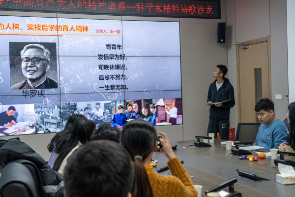 刘小琦同志朗诵了一首缅怀我国伟大科学家钱学森的诗词,他结合钱学森的爱国事迹,谈到“对于肩负时代重任的青年人而言,我们要学习科学家这种爱国精神,胸怀祖国、胸怀人民,在祖国需要的时候,施展才干,报效祖国,将个人的成长成才融入祖国的大发展中。”王伟杰同志向大家分享了“天眼之父”南仁东的事迹,他分享到:“南仁东从壮年走到暮年,把一个朴素的想法变成了国之重器,这种勇攀高峰、敢为人先的创新精神是值得我们学习和践行的”。胡月同志分享了歌颂顾诵芬院士的诗词,她结合自己的科研学习,分享到:“我们作为研究生党员,理应将他视为榜样。在科研中做到动静结合,在有实验灵感和想法的时候能够立马动手去尝试,在遇到不合常规的数据时也能够动起来多去重复确保数据的可靠性;多静下心来深入思考和回顾,及时总结数据规律背后的理论本质,多阅读相关领域的专著,提高自己的理论水平,夯实基础。”耿旭超同志分享了优秀员工王德民院士一腔热血,扎根祖国石油领域,多次带领团队攻克关键性技术,85岁高龄依旧活跃在讲台前的事迹,每一代人的奋斗目标虽不尽相同,但科学家的学术造诣和作风精神薪火相传。王一勋同志朗诵了华罗庚教授对青年人寄予厚望,提携后生、奖掖后学所作的《寄青年》一诗,表示我们要以身作则,在课题组内严于律己,营造一个良好的科研环境和学习风气。