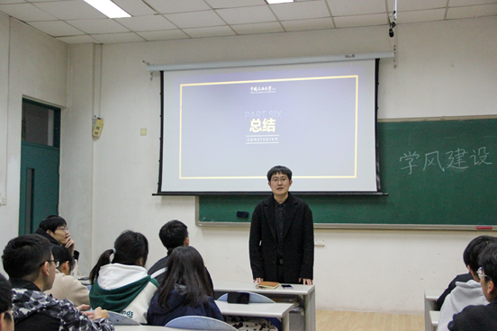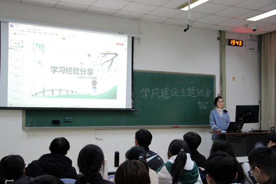 会议开始,马晨介绍了班级的学习现状和学习目标,说明了优良率和及格率的达标要求,号召班级要向优良学风班级目标看齐。他从三个方面提出了班级拟订的学习计划。第一,建立每日单词打卡制度,保证每天的英语学习。第二,实行每日一题,实行小组制,每天晚自习时统一讲解。第三,及时进行模拟测试。随后的个人经验分享环节,由王胜杰和张雨萱先后分享了个人学习经验,他们指出,要注重学会学习老师的ppt,抓住课堂学习和课后练习册,注重考前复习,多看往年真题,学会总结知识点,融会贯通。同时也要端正学习态度,不要有过大的压力,劳逸结合,提高效率。最后,魏孟吉从集体和个人层面提出意见,鼓励同学们积极学习,热爱生活。张金弘以亲身经历为例,告诉同学们如何高效学习,充分利用好时间和身边的资源,希望同学们继续落实学风建设工作,规划好自己的生活。