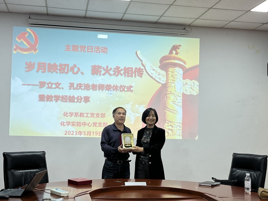 岁月映初心,薪火永相传。5月19日下午,MK体育和化学实验中心党支部在工科A121会议室举行主题党日活动,为罗立文和孔庆池两位老师举行荣休仪式,并进行了教学经验分享。经理刘欣梅、党委书记张永宁、副经理曾景斌应邀出席了仪式,活动由MK体育党支部书记卢玉坤主持。