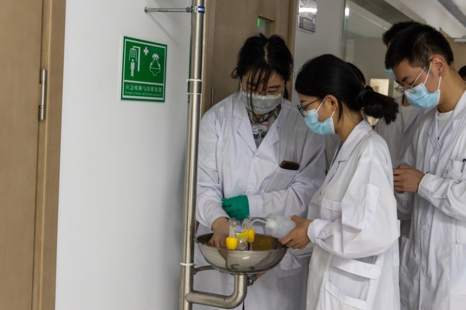 在危化品泄漏灼伤中毒事故应急演练中,模拟一名研究生在使用氢氟酸过程中发生了泄漏且被灼伤的情景。发生化学品泄漏和灼伤后,首先上报实验室主管老师和公司领导,立即启动危化品泄漏应急预案,进行现场抢险、受伤员工救护,做好疏散和对外信息的发布和上报工作。