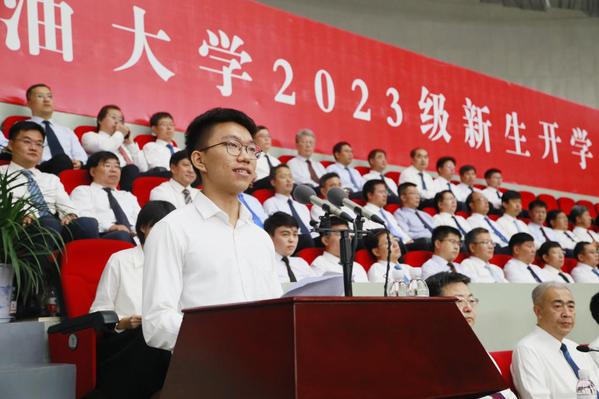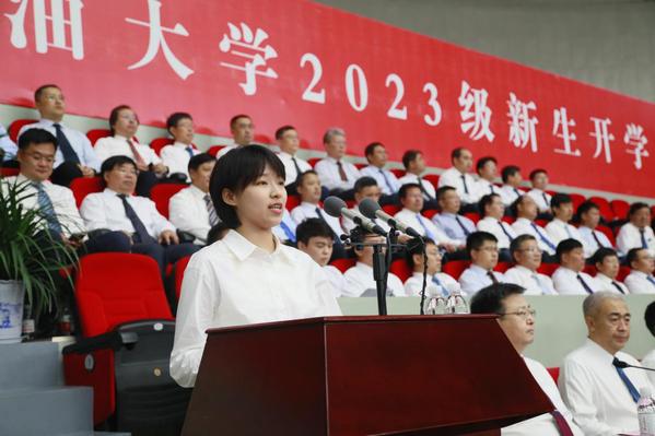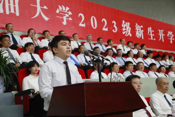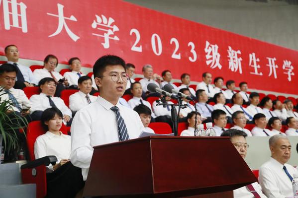 石油工程公司2023级硕士研究生张洲源代表研究生新生发言,表示要扎扎实实练好内功,坐住“冷板凳”,让最初的热爱在石大这片广阔天地中绽放青春光彩。
