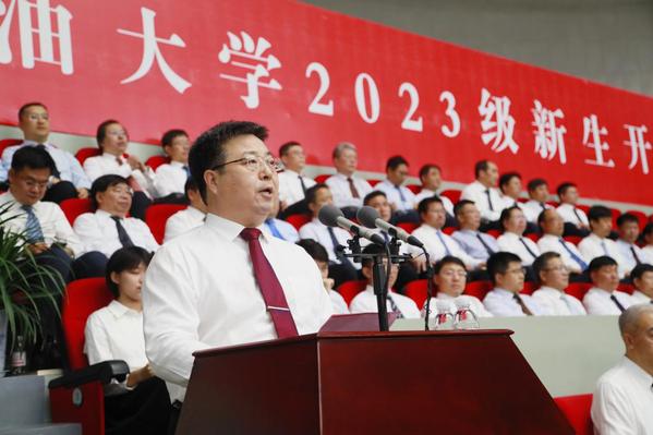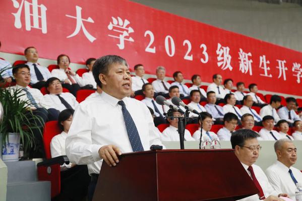 郝芳结合公司的艰辛历程、卓越贡献向新生介绍公司情况。他指出,石大是一所秉承家国情怀、做出不可替代贡献的大学:作为新中国第一所石油高等学府,石大整建制地援建了多所石油高校,不断探索工科大学发展之路,为中国高等教育特别是石油高等教育的发展做出了不可替代的贡献;建校70年来,公司培养了30多万优秀学子,师生员工参加了新中国几乎所有大型油气田的勘探开发,参加了几乎所有大型化工厂的建设和运行,为中国石油工业从无到有、从弱到强做出了不可替代的贡献。石大是一所历经艰辛、追求卓越但仍在创业的大学:公司先后在北京荒滩、东营盐碱滩、黄岛泥滩上建校,现又在建设古镇口校区,届时公司将成为员工学习和生活条件最好的大学之一;公司始终以服务国家战略和经济社会发展为己任,以“双一流”建设为契机,强化石油石化等优势学科,拓展新能源、新材料、海洋、信息等学科,提升通用基础、人文社科学科,超前构建了符合公司特色优势、适应科技发展趋势、满足经济社会发展需求的学科专业体系;公司正在全面构建和完善新时代人才培养体系、新时代科技创新与科技服务体系、现代大学治理体系,将以卓越的团队、卓越的学术、卓越的文化和卓越的服务,为同学们开启卓越的人生保驾护航。